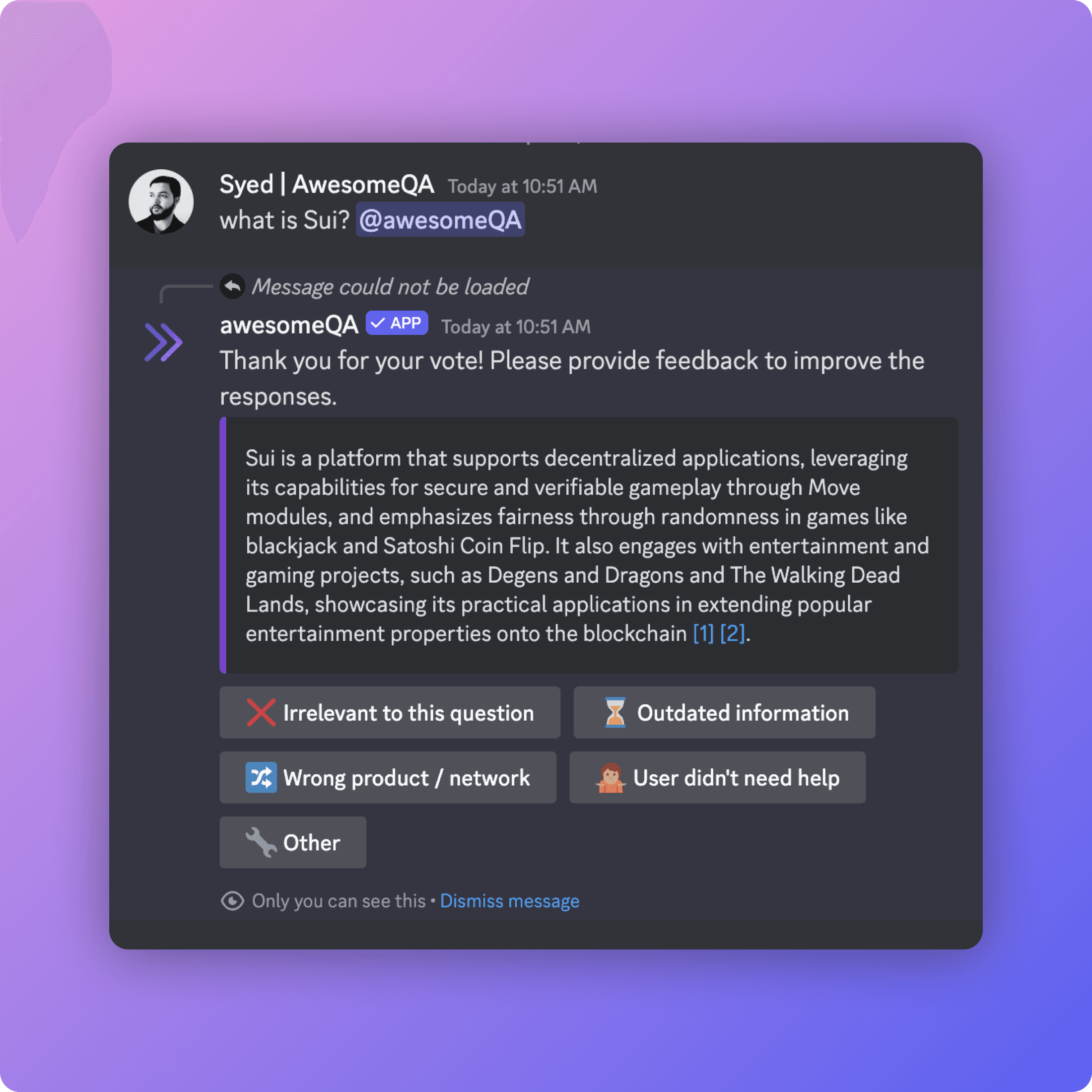 Now, with the new feedback mechanism, trusted users can select predefined reasons for downvoting and provide specific feedback, enabling us to promptly address issues and enhance the bot's performance. This streamlined process ensures that feedback is received promptly and reduces the risk of it being overlooked.