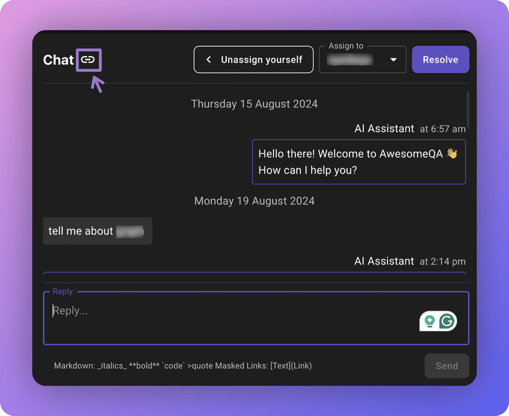Once a support agent sends a message after viewing a suggested answer, the suggestion is automatically hidden. This ensures the interface stays focused and free of outdated content, whether the suggestion was used or not.