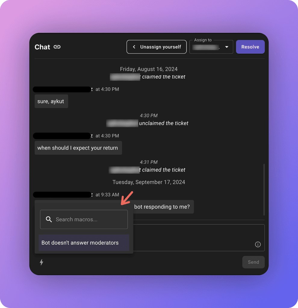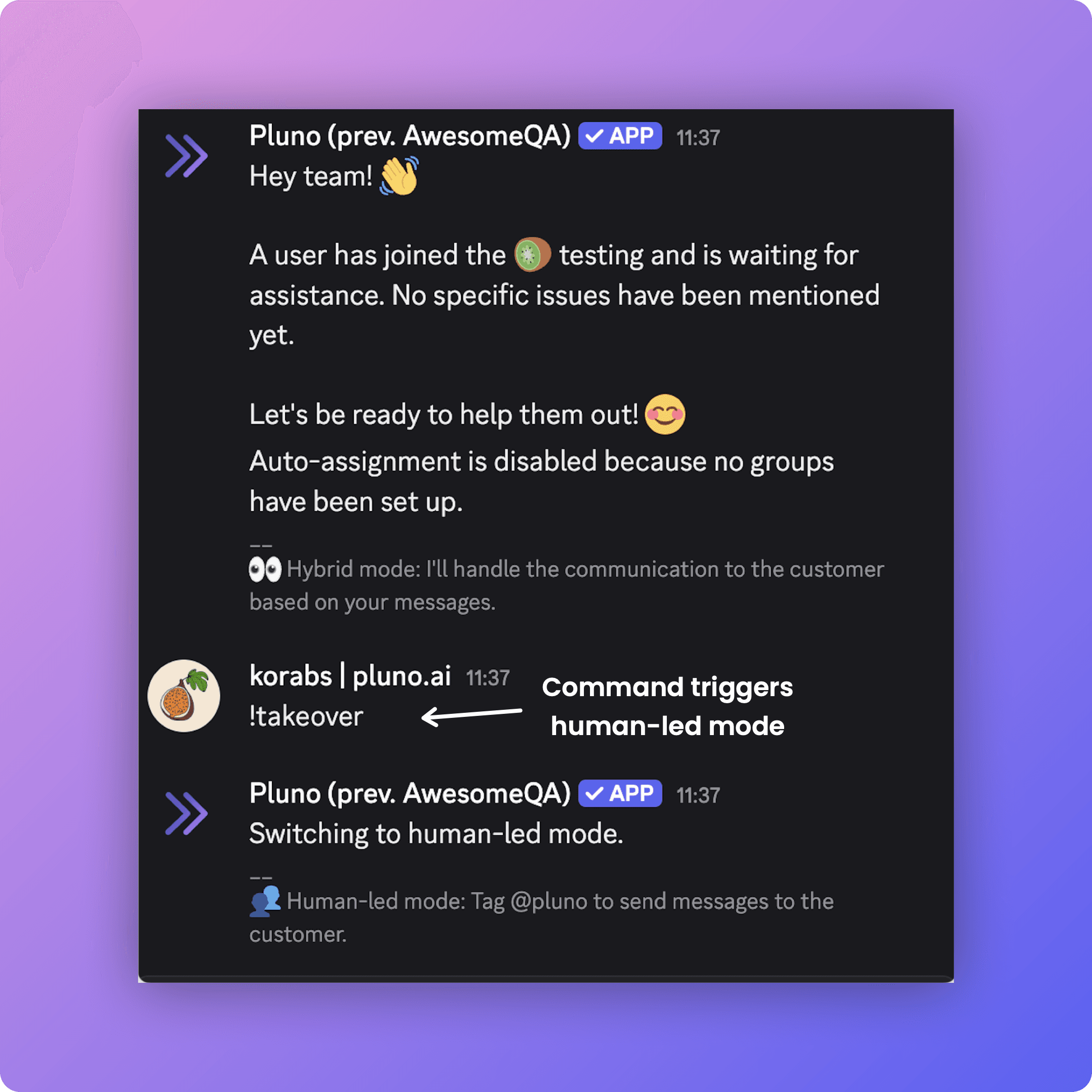 Support teams have more control over when to switch into human-led mode — either by replying directly from the web ticket inbox or by manually triggering the handoff from Slack or Discord using the!takeovercommand. This allows you to step in when a ticket needs to be handled by a human.