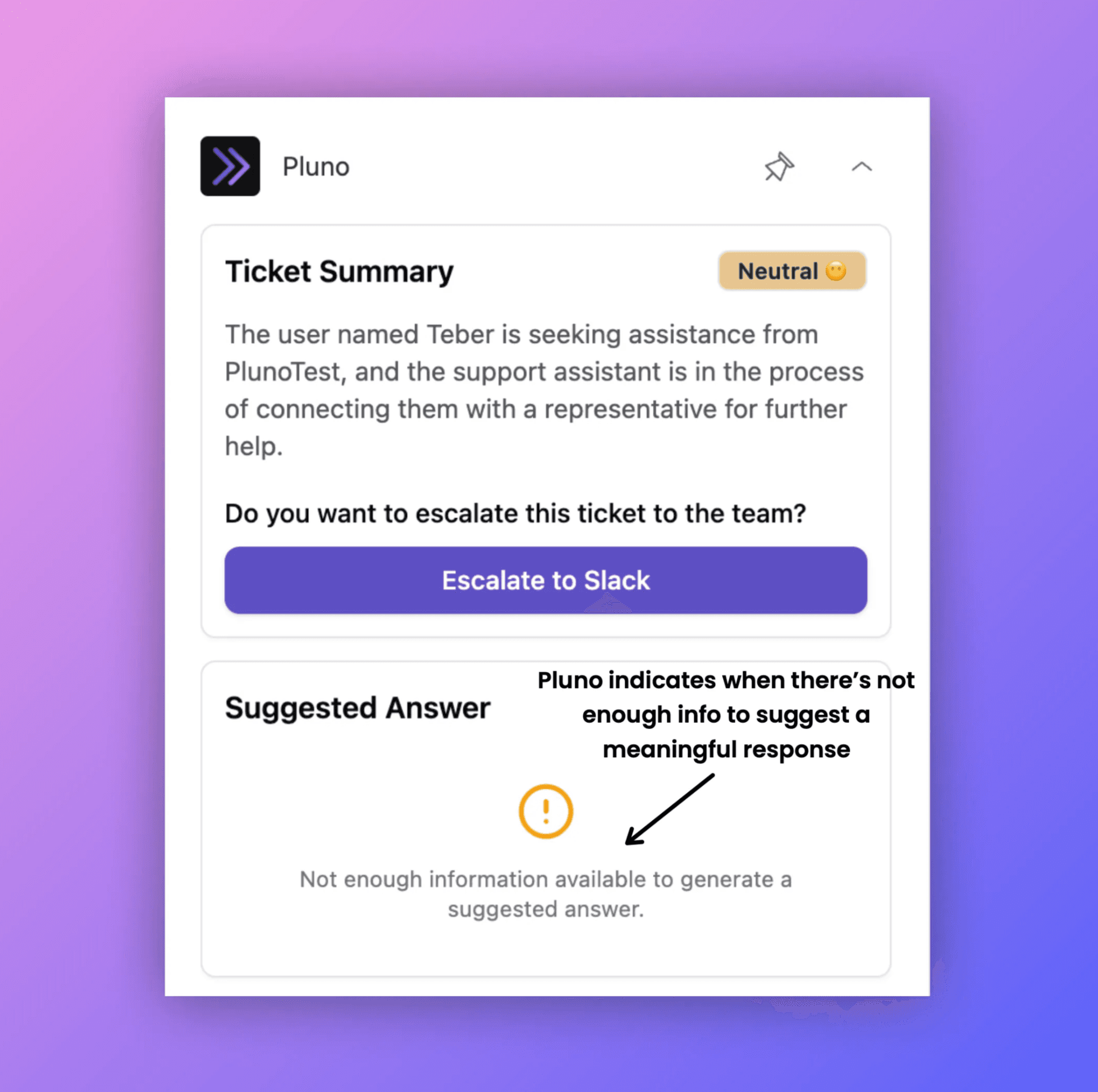 The Pluno Hybrid Agent now holds off on generating a suggested answer when there isn’t enough information to produce a meaningful response. Instead of removing the suggestion entirely, the app now displays a clear message so agents understand why no suggestion is shown. To support this, we have introduced two distinct states for AI suggestions: